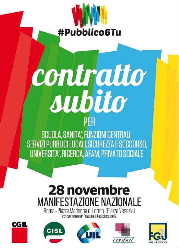 Con lo slogan “Pubblico6Tu, ContrattoSubito”, oltre 20 sigle in rappresentanza di scuola, sanità, funzioni centrali, servizi pubblici locali, sicurezza e soccorso, università, alta formazione artistica, ricerca e privato sociale sfileranno per le vie della capitale concludendo la manifestazione a Piazza Venezia.