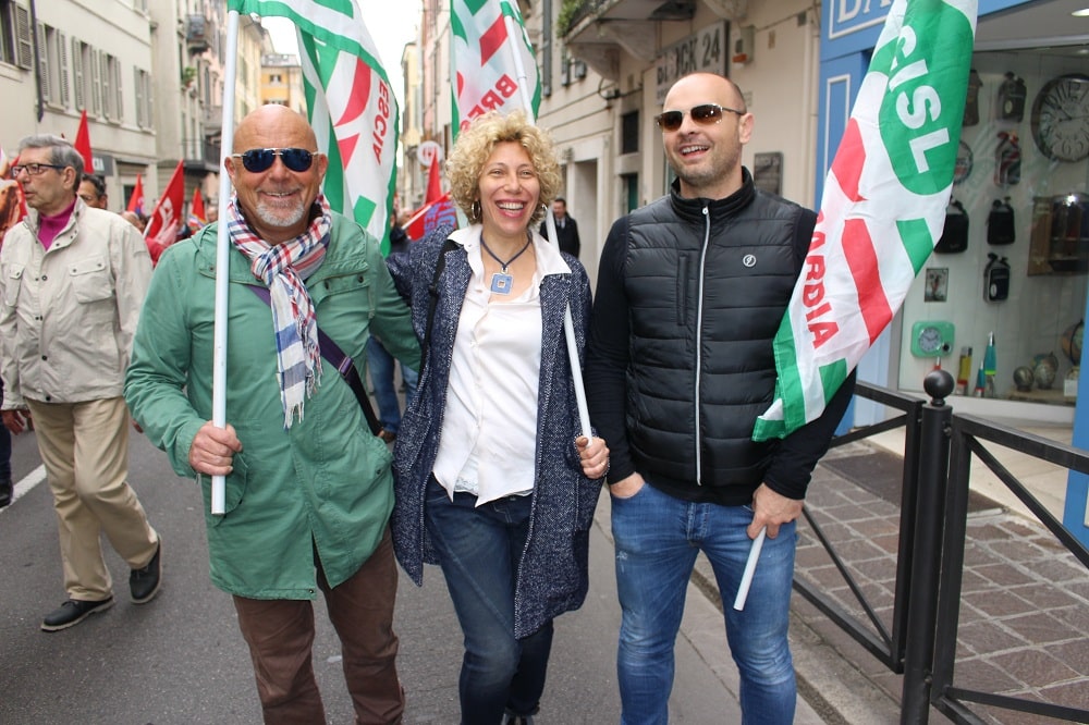 Nella foto scattata questa mattina durante la manifestazione che si è tenuta a Brescia, la Segreteria al completo della Filca Cisl Brescia. Da sinistra: Roberto Bocchio (segretario generale), Sara Piazza ed Enrico Dalè.