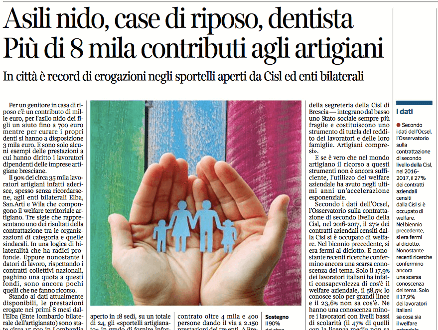 “Come dire – continua l’articolo – che il punto non è solo far attivare le aziende, ma anche, e forse soprattutto, informare i lavoratori. […] Per questo la Cisl di Brescia ha spinto sull’acceleratore. Per questo ha aperto in 18 sedi, su un totale di 24, gli «sportelli artigianato» in grado di fornire informazioni, consulenze e gestione delle prestazioni. Un manipolo di 13 esperti formati appositamente sulle materie del welfare territoriale è infatti a disposizione degli utenti, anche non associati. Nei primi 10 mesi targati 2018 hanno incontrato oltre 4 mila e 400 persone dando il via a 2.150 prestazioni dei tre enti. A Brescia spetta il primato tra le erogazioni, a seguire ci sono la sede di Gardone Val Trompia e Verolanuova.